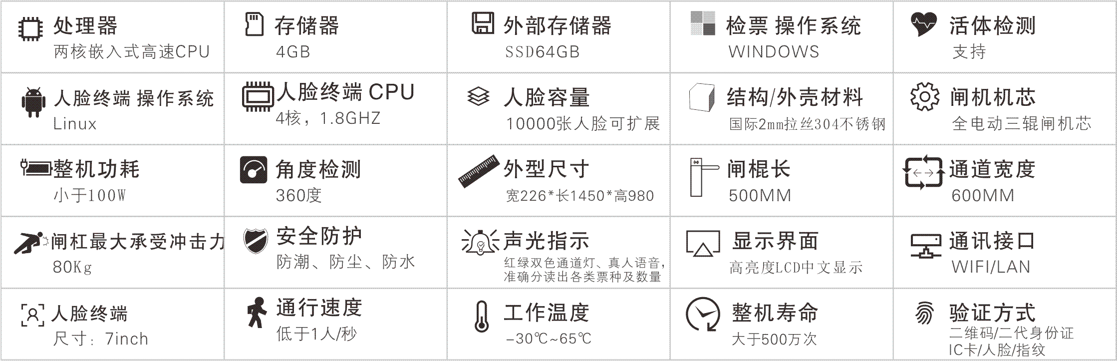 ARM內(nèi)核微處理器(ARM內(nèi)核,可迅速達(dá)到客戶的個性化功能要求);整機無棱角設(shè)計,防止意外碰撞時對人身的傷害,確保行人通行安全;全不銹鋼外殼、機箱部構(gòu)件采用全部防腐處理,經(jīng)久耐用;易控制,好維護,方便管理;兼容主流讀卡器或識別系統(tǒng);人員通行速度約20人/分鐘(正常) 30人/分鐘(快速),可單向或雙向通行;真正意義上的TCP/IP